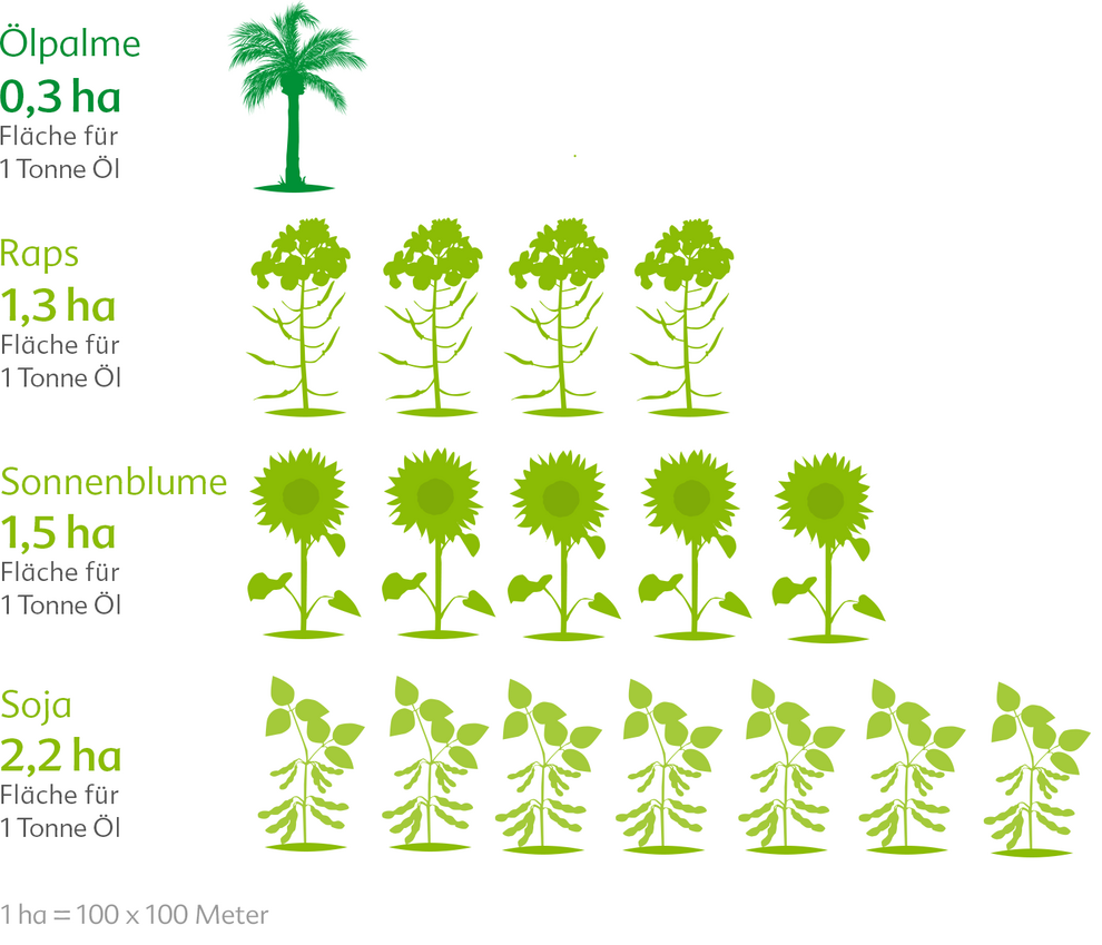 Palmöl benötigt im Vergleich zu anderen Ölfrüchten den geringsten Flächenverbrauch. Kokosöl beispielsweise braucht 5x so viel Fläche, die Folge wären erheblich mehr Treibhausgasemissionen und eine stärkere Bedrohung für Tiere und Wildpflanzen.