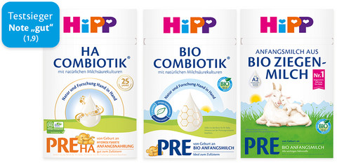 *Quelle: Stiftung Warentest, PRE Nahrungen im Test, Ausgabe 10/2025 Gesamturteil HiPP PRE BIO Combiotik gut (2,4); HiPP PRE HA Combiotik gut (1,9)