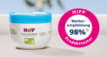 Die neue HiPP HOCHVERTRÄGLICH Familiencreme überzeugt! Klare Weiterempfehlung unserer befragten Eltern. Jetzt mehr erfahren!
