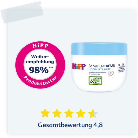 ** 143 Eltern wurden zur HiPP HOCHVERTRÄGLICH Familiencreme befragt. 98% würden diese weiterempfehlen.