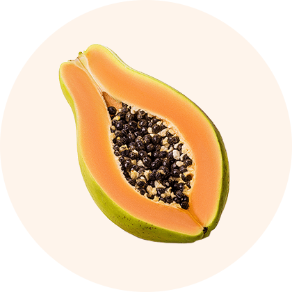 Eine aufgeschnittene Papaya, bei der die schwarzen Kerne freigelegt sind.